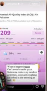 Taking to her Instagram Story, Hina Khan posted a screenshot of Mumbai’s Air Quality Index (AQI), which showed the level touching 209. The reading falls under the severe category, indicating hazardous air conditions that can significantly affect respiratory health.